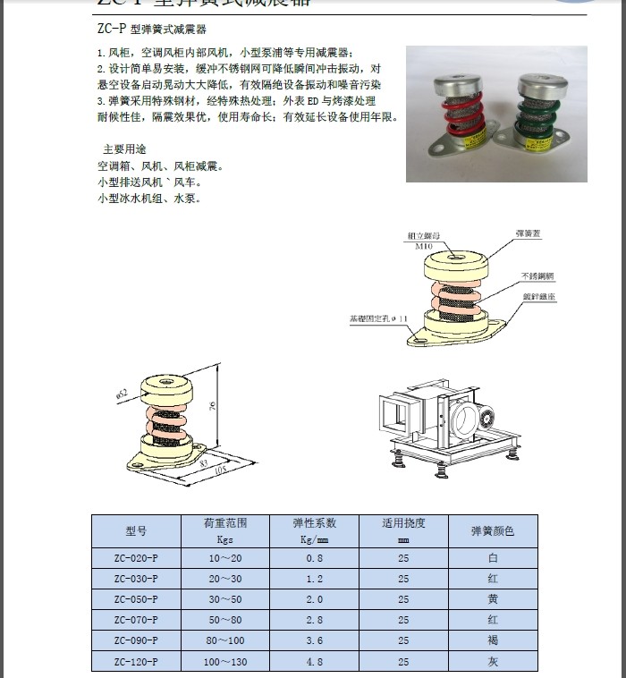 产品简介: 1、弹簧采用低频率值设计,并经喷塑处理,耐候性*,防震效果好。 2、*部、底部均采用防滑耐磨橡胶以及固定螺栓,安全性能大大提高。 3、安装简单并根据实际需要调整..